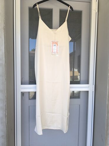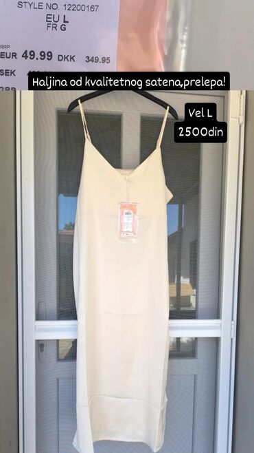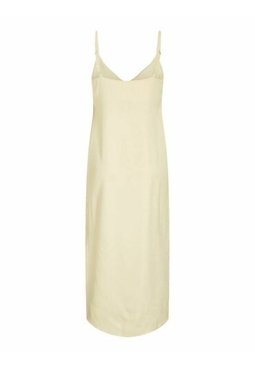 Ženska midi haljina u bež boji, izrađena od satena. Haljina ima tanke bretele i V-izrez, što doprinosi elegantnom izgledu. Dužina do lista čini je pogodnom za različite prilike, od dnevnih do večernjih.
