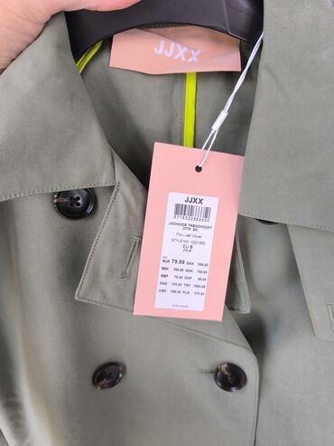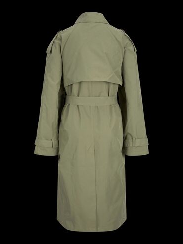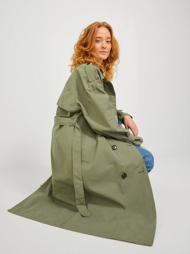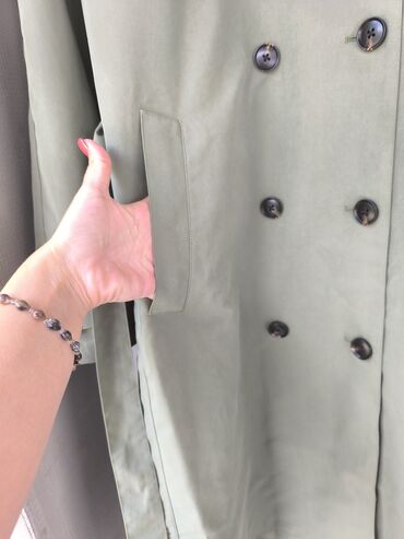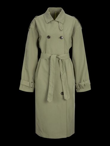DugmadKlasičan ženski mantil maslinasto zelene boje, idealan za prelazne periode. Mantil je dug, sa dvostrukim kopčanjem na dugmad i kaišem oko struka za podesivu siluetu. Ima duboke bočne džepove za praktično odlaganje sitnica i trake sa kopčama na rukavima, što dodaje elegantan detalj. Funkcionalan i šik izbor za svakodnevno nošenje ili posebne prilike.