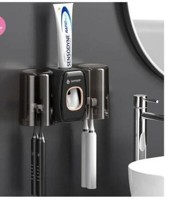 - Multifunkcionalna stanica za kupatilo: centralni automatski dozator paste za zube + dve zatvorene komore/čaše sa držačima za četkice.