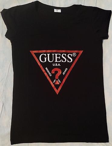 Ženska pamučna majica kratkih rukava – klasičan kroj sa okruglim izrezom. Na levoj strani grudi sitan print/logotip (različiti motivi u zavisnosti od varijante: trogaoni “Guess?”, “DAK” natpis ili ...