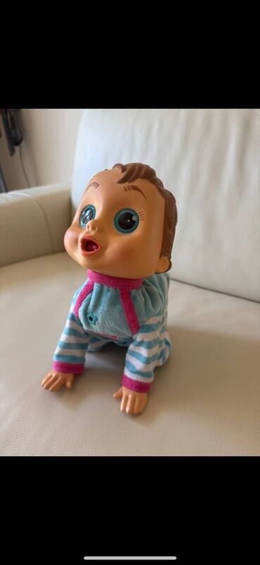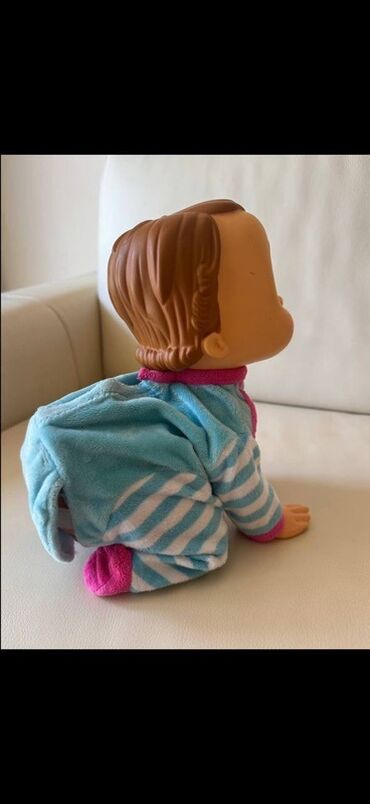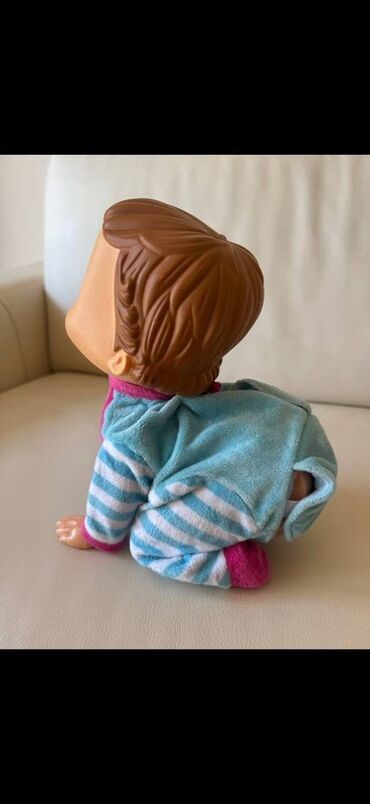 - Slatka beba sa velikim plavim očima i kratkom smeđom kosom, izrađena od čvrste plastike sa mekanim detaljima.