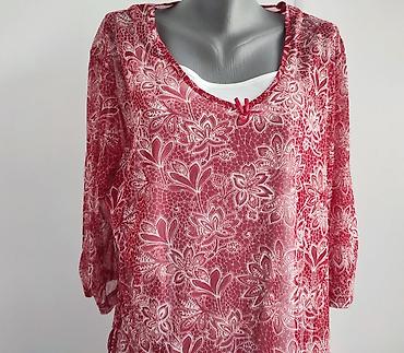 Ženska tunika dugih rukava sa živopisnim printom - Model: majica/bluza sa V-izrezom - Veličina: Medium (oznaka na etiketi) - Boja i dizajn: dominantno ciklama/ružičasta podloga sa bogatim cvetnim ...