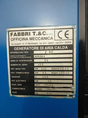 Pokupiti na licu mestaPeć za grejanje 5285_24. Termogen na čvrsto gorivo (drvo, papir, drveni ugalj… ). Kapacitet ložišta: 15-25 kg / paketu. Maksimalna efikasnost: 115 KWt (99.500 Kcal/h). Kapacitet grejanja: 93 KWt (do 80.000 Kcal/h). Zagrejan vazduh: 90° C. Protok vazduha: 6.300 m3 / h. Marka: Fabbri Termomeccanica , model F 85 SV. Snaga ventilatora za distribuciju toplog vazduha: 1,1 KW. Dimenzije ložišta: 500 x 350 x 800 mm (dubina). ? ? ? ? Godina proizvodnje: 2014Težina: 365 Kg. Mašina za grejanje većih radionica i hala, plastenika, sportskih balon terena… Kao novo, uvoz iz Italije.