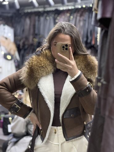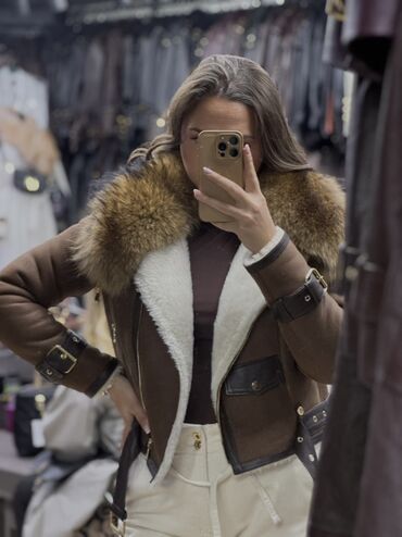 Ženska kraća pilotska jakna od smeđeg antilopa sa bogatom krznanom kragnom i belom unutrašnjom postavom od veštačkog krzna/šišane vune. Detalji od tamne kože: ojačani rubovi, preklopni džep sa dugmetom i kaiševi. Metalni zlatni rajsferšlus sa strane za asimetrično kopčanje, dodatni drukeri i nitne. Kaiševi sa metalnim šnalama na manžetnama i u struku za podešavanje. Topla, strukirana silueta, dužina do pojasa. Elegantna kombinacija materijala i boja za zimske i prelazne outfite.
