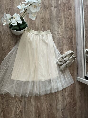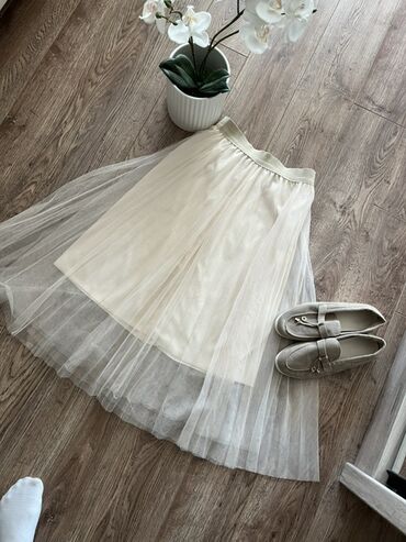 - Dizajn: dvoslojna suknja – glatka, neprovidna podstava u krem boji + spoljašnji proziran sloj od finog tila, blago plisiran po celoj dužini.