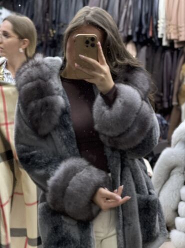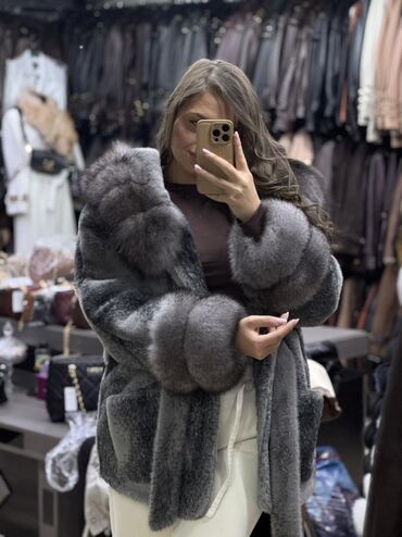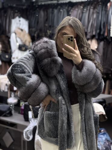 - Materijal: bogato, gusto krzno u više tonova sive; ekstra voluminozni manžetni i detalji na ramenima/okovratniku od dužeg, pufnastog krzna u tamnijoj sivoj