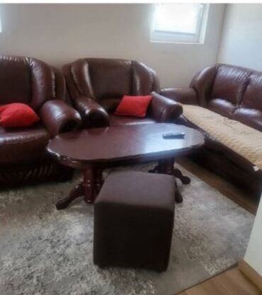 - Dnevni boravak: garnitura od tamno braon kože (trosed, dvosed i fotelja), ukrasni crveni jastučići, klub sto od punog drveta sa profilisanim ivicama, tabure, TV montiran na zid, veliki tepih.