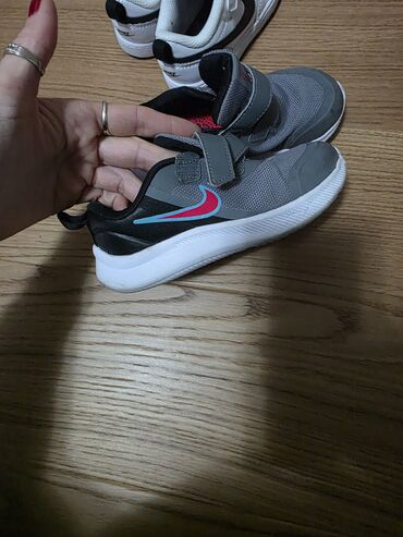 Dečije Nike patike – 2 para - Modeli: - Bele kožne patike sa velikim crnim Swoosh logom i duplim čičak-kaiševima. - Sive patike od mrežastog materijala sa tamnosivim detaljima, ružičasto-plav...