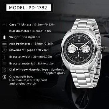 OPIS: Funkcije: Hronograf Mehanizam: Seiko VK63 Mecha-Quartz Vodootpornost: 10bar/100m Prečnik kućišta: 39mm Debljina kućišta: 13.5mm Širina narukvice: 20mm Dužina narukvice: 200mm Težina: 138g Safirno staklo Šok otpornost Materijal kućišta: 316L Nerdjajući čelik Materijal narukvice: 316L Nerdjajući čelik Neo-Display premaz na kazaljkama i markerima radi vidljivosti u mraku Svi Pagani Design satovi poseduju internacionalnu garanciju proizvodjaca