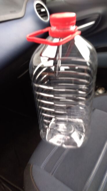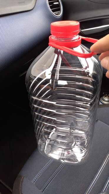- Veliki kanister: providan PET, približno 5–10 l zapremine (visok, sa rebrastim zidovima), crveni navojni čep i crvena preklopna ručka za lako nošenje. Široko grlo, stabilno dno.