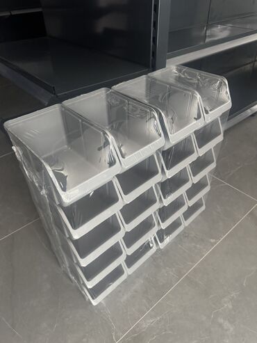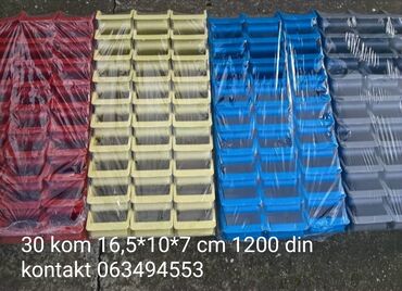 Plastične kutije/kontejneri za organizaciju sitnog materijala (šrafovi, tiplovi, delovi, alat). Višekratni, naslonivi i pogodni za police i radionice. Dostupni u više boja (crvena, žuta, plava, siva).