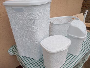 Set ukrasnih plastičnih korpi/posuda za kupatilo i domaćinstvo, bela boja, čipkasti reljefni dizajn.