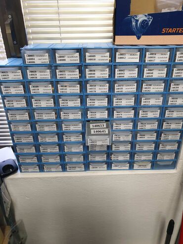 - Modularni plastični regali sa fiokama: sivi i plavi ormarići sa više manjih fioka pogodnih za zavrtnje, matice, alate, elektronske komponente i sitan potrošni materijal. Fioke se lako izvlače, imaju prednju ručkicu i prostor za nalepnice/oznake. Mogu se slagati jedan na drugi ili kačiti na zid (vidljivi primeri sa etiketama).