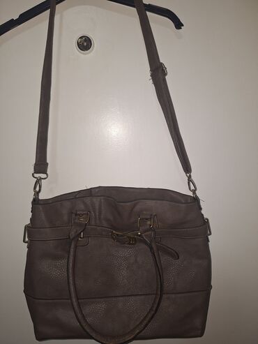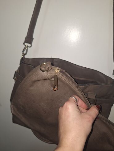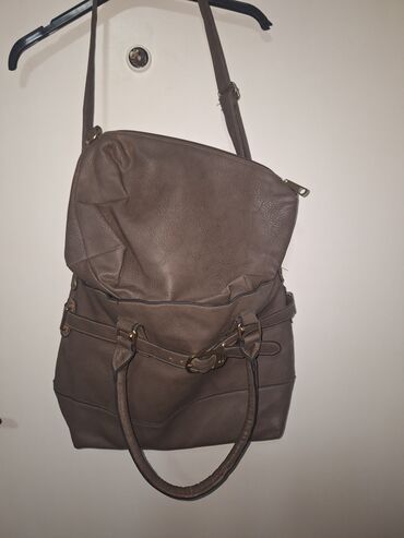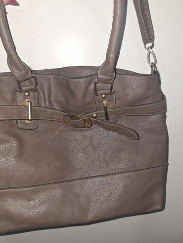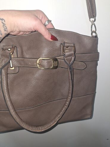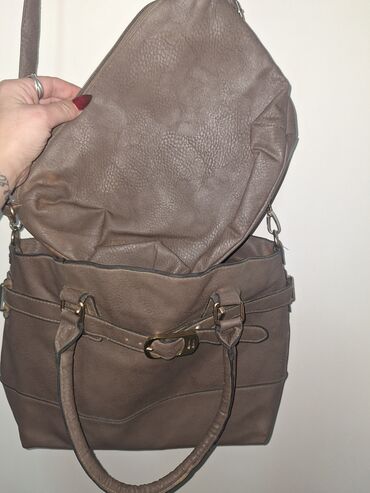 Ženska torba – dvobojna (kamel/teget), sa mnoštvom pregrada i dodatnom dugom kaiš trakom. - Materijal: eko koža sa finom teksturom, postava sa dezenom. - Rukovanje: dve čvrste ručke za nošenje u r...