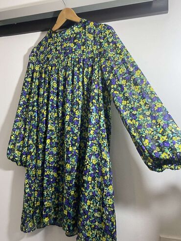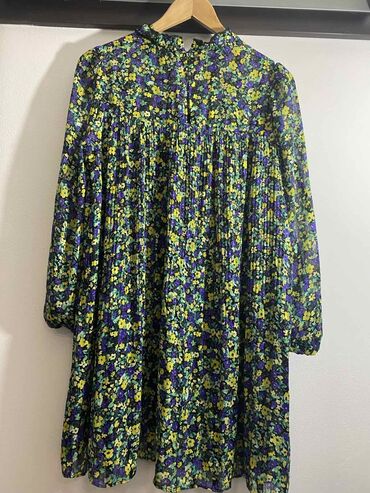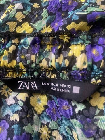 - Haljina: ZARA, veličina XL (EUR/USA XL, MEX 32). Lepršav kroj A-linije sa sitnim naborima ispod grudi i duž tela. Dugi, blago puf rukavi sa elastičnim završetkom. Visoka okrugla kragna sa diskretnim kopčanjem pozadi. Tkanina lagana i poluprozirna, crna podloga sa sitnim cvetnim printom u žuto‑zelno‑ljubičastim tonovima. Dužina iznad kolena/mini do sredine butina (zavisno od visine).