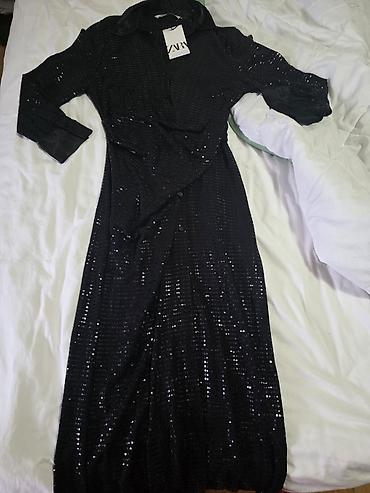Crna haljina sa dubokim dekolteom. Duzina i sirina na slikama.