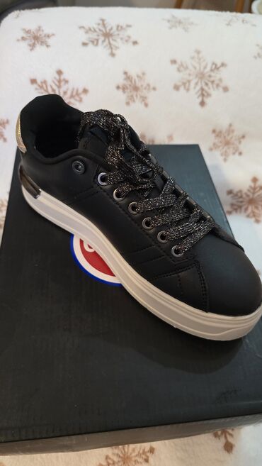 Plitke platnene patike, tamnoplave boje sa belim pertlama i gumenim vrhom. Klasičan “sneaker” dizajn sa kontrastnim belim štepom i metalnim rupicama za pertle. Gumeni đon sa prugom i teksturom na p...