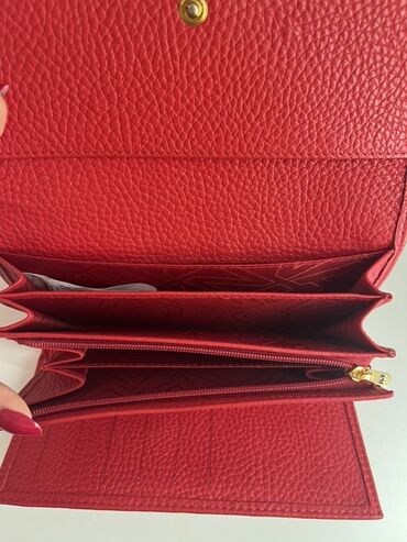 Crveni kožni novčanik – ženski model, preklopni - Materijal: prirodna koža sa zrnastom teksturom - Boja: intenzivno crvena - Zatvaranje: metalni pritiskač - Unutrašnji raspored: - Više pretinaca...