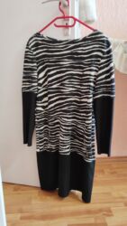 Haljina sa zebrinim printom i dugačkim rukavima. Gornji deo u crno-belim prugama, donji deo u jednobojnoj crnoj boji, sa vizuelnim blokom boja koji izdužuje figuru. Okrugli izrez, ravnog kroja, dužina do kolena ili malo ispod. Diskretan metalni rajsferšlus na leđima olakšava oblačenje. Materijal je elastičan i udoban, pogodan za svakodnevno nošenje ili poslovne prilike. Dva funkcionalna kosa šlica-džepa napred za praktičnost. Klasičan, modernog dizajna, lako se kombinuje sa čizmama ili salonkama.