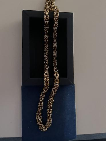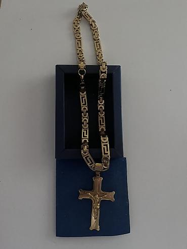 - Ogrlica 1: masivni lanac sa geometrijskim (grčkim) motivom, sjajna zlatna boja. Privjesak krst sa prikazom raspeća, detaljno graviran, polirane ivice.