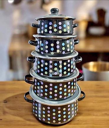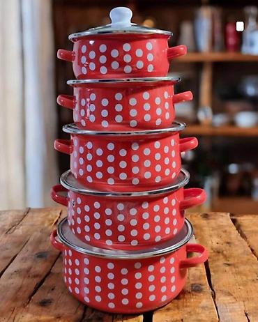 - Materijal: emajlirani čelik sa ivicama ojačanim metalnim obručem; stakleni poklopci sa ručkom (gornji poklopac na crvenom setu sa belom ručkom)