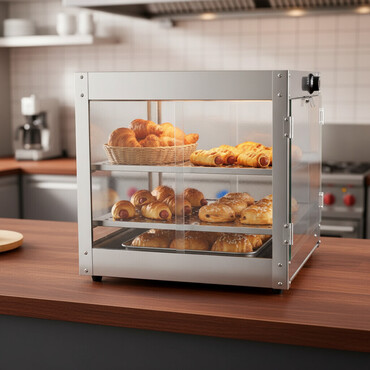 Profesionalna topla vitrina sa policama, idealna za izlaganje i održavanje toplote hrane u pekarama, restoranima, bifeima i kioscima.
