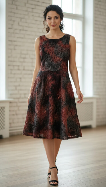 Dizajn: kombinacija tamno crnih/sivih i toplih crveno-bakarných tonova sa suptilnim prelazima, što naglašava teksturu čipke. Okrugli izrez, dužina do iznad kolena (zavisno od visine).