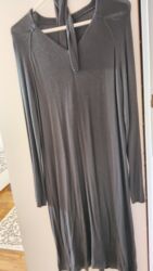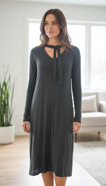 Duga crna haljina sa dugim rukavima i vezivanjem oko vrata. Mekan, padajući materijal koji lepo prati liniju tela bez stezanja. V-izrez napred sa trakama koje se mogu vezati u mašnu ili ostaviti opušteno. Kroj je ravan, blago širi ka donjem delu, dužine do ispod kolena/do listova (zavisno od visine). Idealna za večernje prilike ili dnevne kombinacije uz čizme ili patike. Boja: tamno siva/ugljen. Detalj: diskretan sjaj tkanine. Praktična i udobna, lako se stilizuje slojevima.