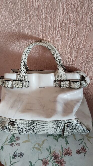 - Materijal: veštačka koža (glatka površina), akcenti sa teksturom/printom zmijske kože na ručkama, pojasnim trakama, dnu i bočnim delovima.