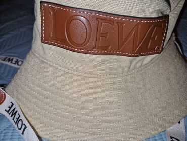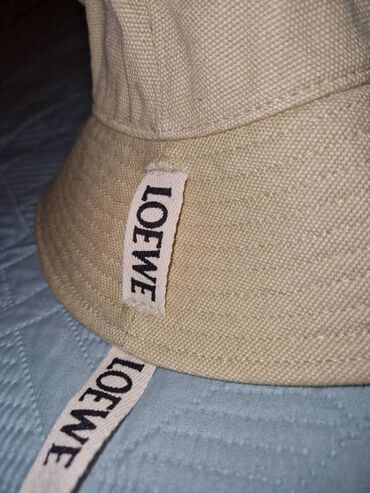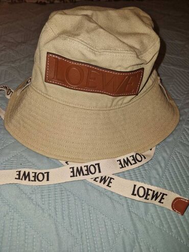 LOEWE šešir sa širokim obodom, bež boje. - Materijal: čvrsto tkan platneni kanvas - Detalji: kožna pravougaona aplikacija napred sa utisnutim LOEWE logotipom; duže platnene trake sa odštampanim LO...