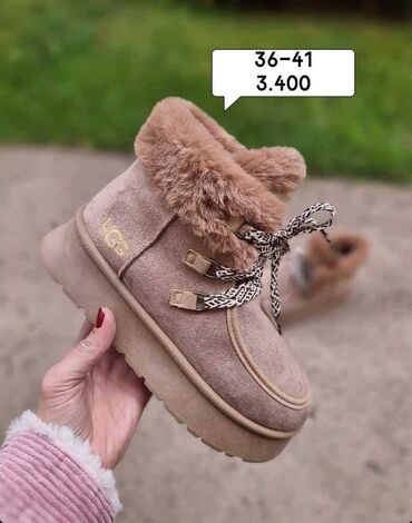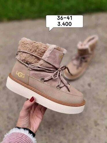 Zimske ženske čizme sa toplom krznom postavom i ravnim platformskim đonom. Gornjište kombinacija glatkog materijala i ojačanja na prstima i peti, sa ukrasnim šavovima. Klasično vezivanje sa metalnim kukicama i rupicama obezbeđuje stabilno prijanjanje. Deblji, reljefni đon pruža dobro prianjanje i dodatnu izolaciju od hladnoće. Diskretni zlatni logotipi sa strane i na jezičku. Dostupne boje: crna, bež/bela i puder roze sa bež detaljima.