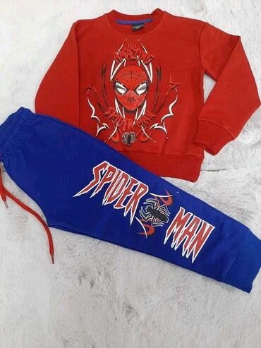 - Spider‑Man komplet: crveni duks sa velikim printom maske i natpisom “The Amazing Spider‑Man”, plave trenerke sa velikim “Spider‑Man” natpisom i motivom pauka.
