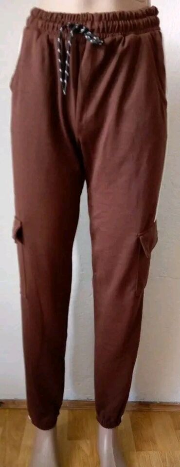 trenerke/jogger pantalone sa elastičnim pojasom i ranflama na nogavicama. Univerzalne velicine. Model sa bočnim džepovima i dekorativnim etiketama: kvadratna aplikacija na butini sa natpisom “MICR...+381 63 18739xx