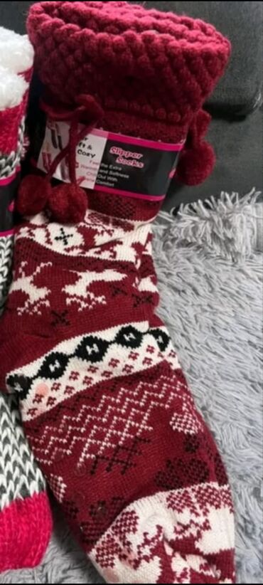 Idealne za nošenje kod kuće tokom hladnih dana, kao tople papuče-čarape koje greju stopala i gležnjeve. Oba para za 500 dinara.