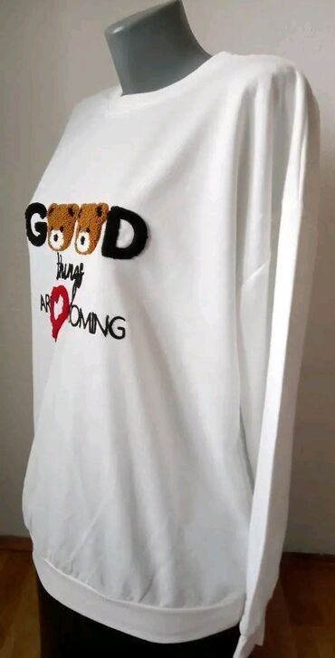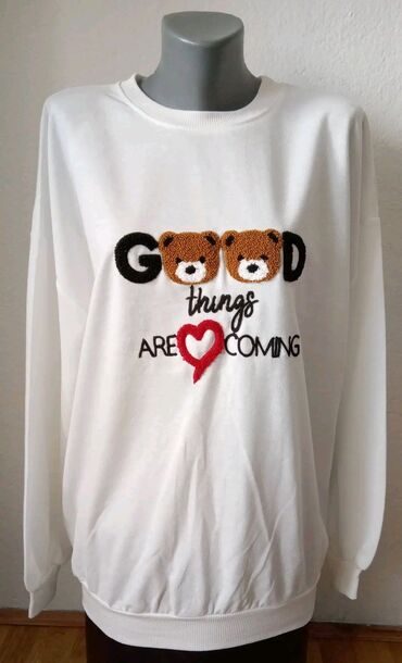- Model 1: bela dukserica sa pufastim/reljefnim vezom napred. Natpis: “GOOD things ARE ♥ COMING”, slova “O” izvedena kao mede u 3D teksturi. Mekana tkanina, blago opušten kroj.
