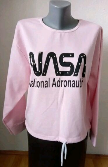 - Model 2: svetloroze dukserica sa crnim printom “NASA” ukrašenim malim nitnama/kamenčićima; ispod natpisa stoji “National Adronauts”. Ravni okrugli izrez, duži rukavi, na dnu tunel sa učkurom za podešavanje širine.