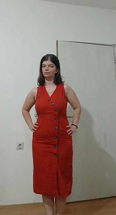 Crvena ženska haljina bez rukava, midi dužine. Model sa V-izrezom i asimetričnim preklopom napred. Kopčanje ide dijagonalno duž cele prednje strane sa više dekorativnih dugmadi u tamnoj boji. Krojena da prati liniju tela, blago strukirana. Materijal deluje lagan i pogodan za toplije dane. Idealna za svakodnevne i poluformalne prilike. Boja: cigla/crvena. Dizajn jednostavan i elegantan, lako se kombinuje sa sandalama ili patikama. Veličina nije naznačena na etiketi na fotografiji.