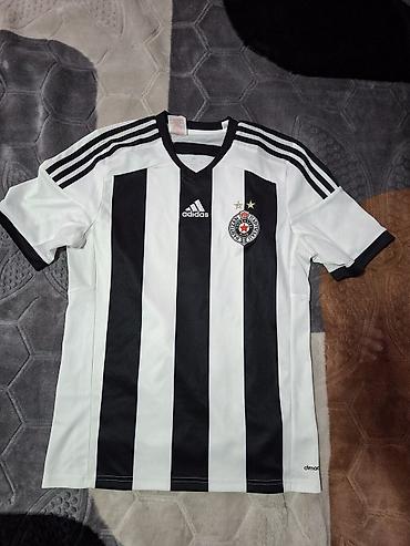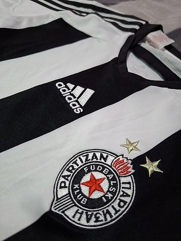 Adidas Partizan dres – crno-bele pruge, zvanični grb FK Partizan sa dve zvezdice. Model sa V-izrezom i tri Adidas pruge na ramenima. Izrada: Dri-Fit/Climacool materijal za prozračnost i brzo sušenje; mrežasti paneli sa strane za bolju ventilaciju. Vezeni Adidas logo na desnoj strani grudi, vezeni klupski grb na levoj. Kratak rukav, lagana i elastična tkanina pogodna za trening i svakodnevno nošenje. Unutrašnji print oznaka (bez etikete koja grebe). Klasični kroj.