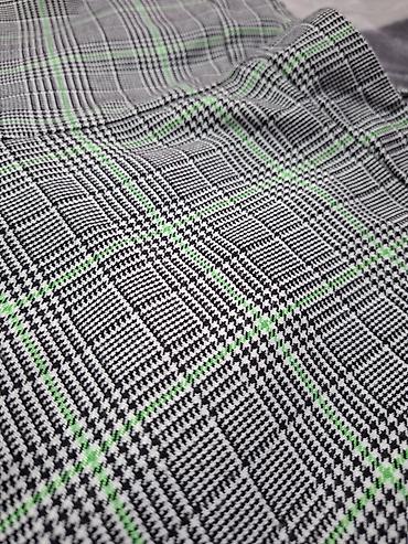 - Šara: pepito (houndstooth) sa diskretnim zelenim linijama u karo rasporedu