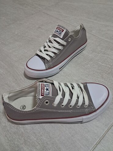 Platnene patike niskog profila, sivi model sa belim gumiranim vrhom i đonom. Klasično vezivanje sa belim pertlama kroz metalne ringlice. Bočni ventilacioni otvor. Gumeni đon sa crnim prugama i prednjim zaštitnim ojačanjem, rub đona sa bordo linijom. Unutrašnjost tekstilna, bela. Na jezičku nalepnica sa natpisom “All Star”. Veličina: 38. Odličan svakodnevni model, lagane i udobne za proleće/leto, lako se kombinuju uz ležerne odevne kombinacije.