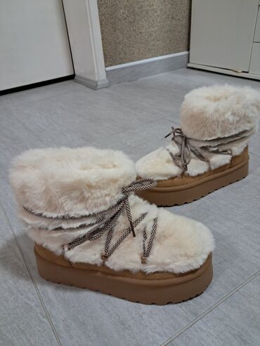 - Boja: krem/bele gornje površine od mekog veštačkog krzna, sa smeđim đonom i donjim delom od brušenog materijala.