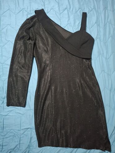 JednobojniElegantna ženska mini haljina crne boje, dizajnirana sa asimetričnim krojem na jedno rame. Haljina ima dugi rukav na jednoj strani, dok je drugo rame otkriveno i podržano tankom bratelom. Izrađena je od sjajnog materijala sa diskretnim svetlucavim česticama, što joj daje sofisticiran izgled. Kroj haljine prati liniju tela, ističući figuru. Idealna je za večernje izlaske, proslave i posebne prilike.