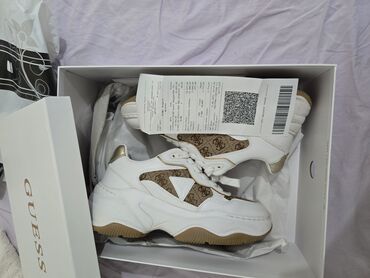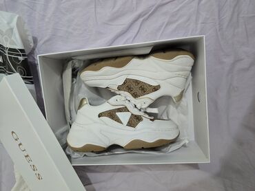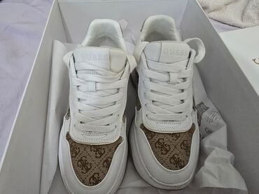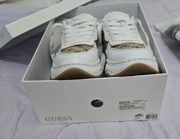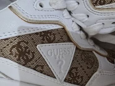 - Detalji: trokutasti GUESS USA logo sa strane, zlatni akcenti oko šava i na peti, bele pertle.