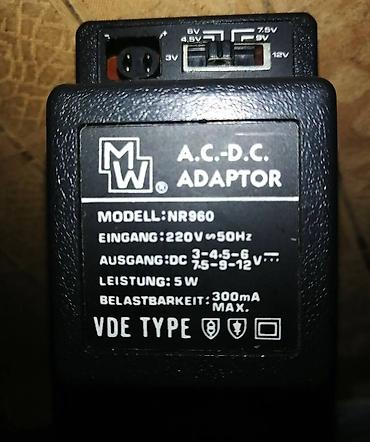 Prodajem višenamenski strujni adapter "AC-DC" nemačke proizvodnje "MW", sa mogućnostima izbora napona za napajanje raznih uređaja, pretvaranjem 220V (AC) na 3V, 4,5V, 6V, 7,5V, 9V i 12V (DC); Uz adapter ide i prilagođen kabl sa 6 formata svih standardnih ulaza za uređaje! Neupotrebljavan, samo isproban! Potrošnja svega 5 W! Boja: crna;