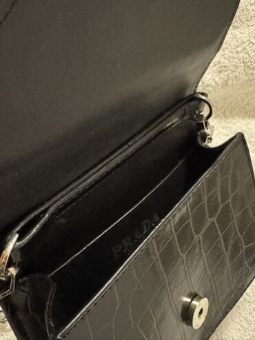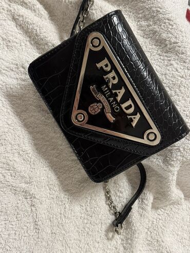 Elegantna torbicaCrna mini torbica sa lančanim kaišem i krokodil-efekt teksturom. Prednja strana ukrašena velikom trokutastom pločicom sa metalnim okvirom i natpisom „PRADA MILANO”. Preklop se zatvara magnetnim dugmetom. Unutrašnjost ima jedan glavni pregradak i dodatni ravan džep za kartice/dokumenta. Metalni detalji u srebrnoj boji, odvojivi kožni remenčić sa kratkim lancem. Kompaktan format – idealno za telefon, ključeve i osnovne sitnice. Elegantan večernji i casual dodatak u crnoj boji koji lako ide uz sve kombinacije.