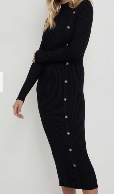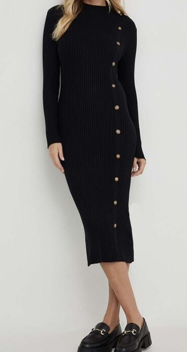 Crna rebrasta džemper-haljina, midi dužine. - Kroj: pripijena silueta