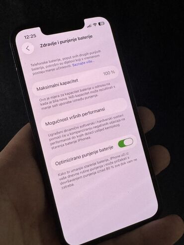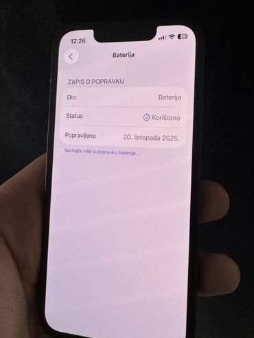 - Baterija: Maksimalni kapacitet 100% (vidljivo u podešavanjima). Evidencija popravke baterije prikazuje zamenu/servis evidentiran 20. listopada 2025.