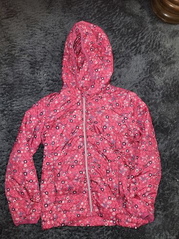Dečja jakna sa kapuljačom – šarena cvetna štampa - Topla, prošivena unutrašnjost u tamnoplavoj boji - Spoljašnji materijal sa živopisnim cvetnim dezenom (narandžaste, roze, ljubičaste nijanse sa z...