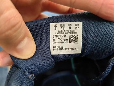 - Boja: tamnoplava (navy) sa narandžastim detaljima i belim đonom