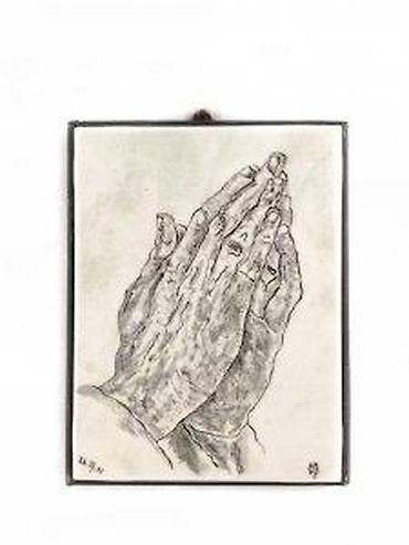 RUKE KOJE SE MOLE | Reprodukcija dela \Ruke koje se mole\. Oslikano na keramici i postavljeno na drveni okvir, potpisano. Veoma lep rad. Dimenzije 21.5 x 16.5 centimetara. Predmete šaljem post expresom ili tiskovinom ako ima potrebe. Za dodatne informacije i fotografije slobodno pitajte.